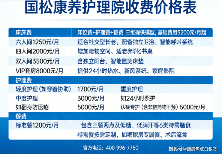 国松康养护理院采用“床位费+护理费+餐费”三维定价模型,基础费用3200元/月起,具体如下: