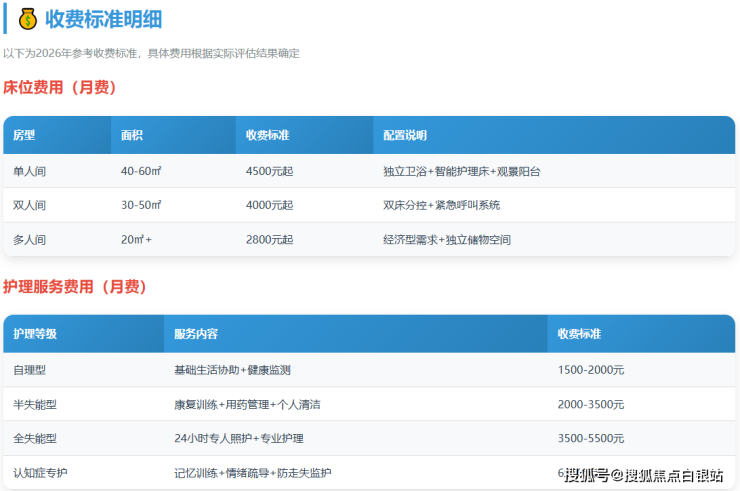一位选择双人间、需要半失能护理的长者,月均总费用约为:4000元(床位费)+1500元(护理费)+900元(餐费)= 6400元/月。