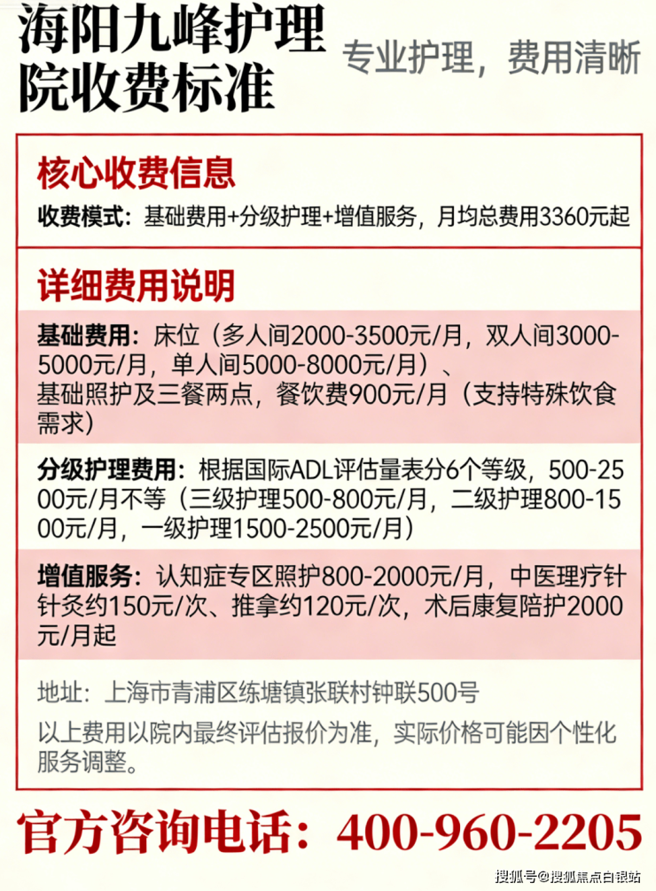 海阳九峰护理院采用"基础费用+分级护理+增值服务"的透明计价模式,总价格3360元/月起(以院内报价为准)。费用构成清晰,无隐形消费,具体项目如下: