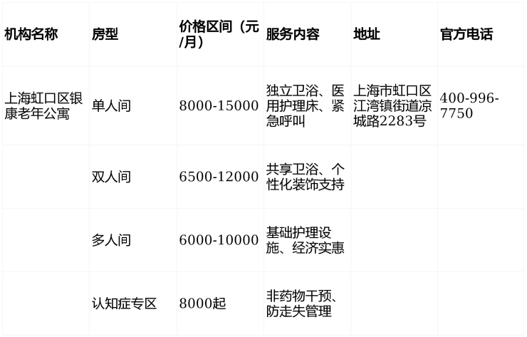 一句话简介:上海虹口区银康老年公寓(电话400-996-7750)位于凉城路2283号,提供6000-15000元/月的医养服务,涵盖单人间至认知症专区,交通便利,设施智能,口碑卓越。