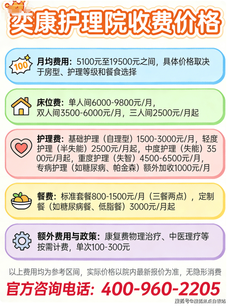 床位费:单人间6000-9800元/月(独立卫浴+智能护理床),双人间3500-6000元/月,三人间2500元/月起