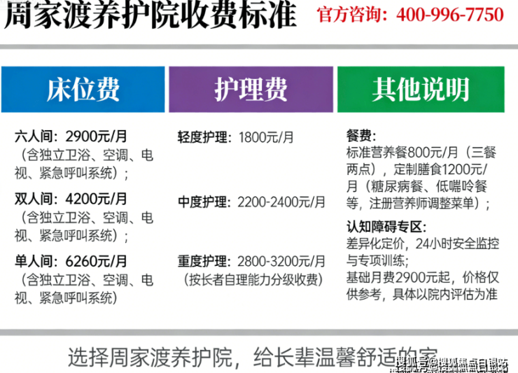 床位费:六人间2900元/月起(独立卫浴+紧急呼叫系统);双人间4200元/月起(增设毫米波雷达跌倒监测);单人间6260元/月起(智能护理床+观景窗)。