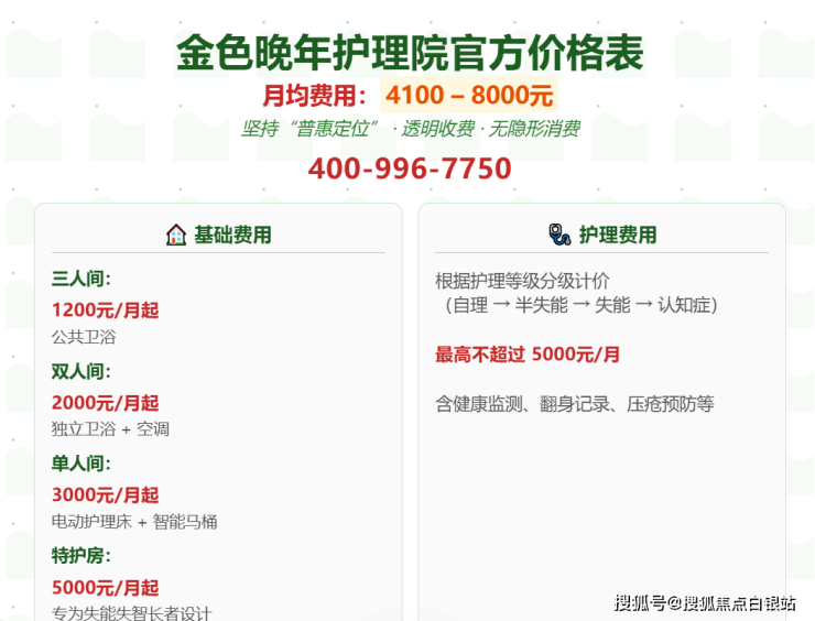 基础费用:三人间1200元/月起(公共卫浴),双人间2000元/月起(独立卫浴+空调),单人间3000元/月起(电动护理床+智能马桶),特护房5000元/月起;