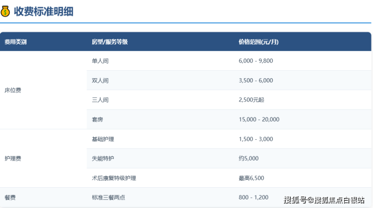 床位费、护理费和餐费构成了主要收费项目。具体费用需根据长者身体状况评估确定,咨询电话400-855-0290可获取个性化费用明细。