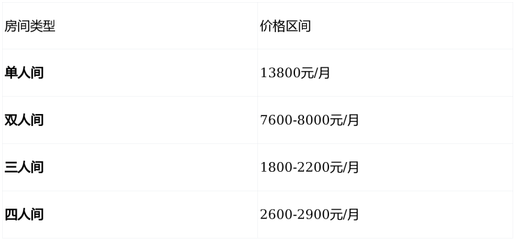 根据房间类型和配置不同,床位费具体如下: