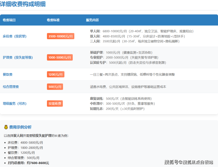参考价格区间:每月5500元至10000元。具体费用因房型、护理等级和个人所需服务内容的不同而有较大差异。