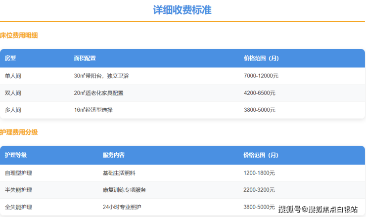 一位选择双人间、需要半失能护理的长者,月费用约为:4200元(床位费)+ 2200元(护理费)+ 1200元(餐费)= 7600元/月,完全符合7000-9000元/月的总体价格区间。