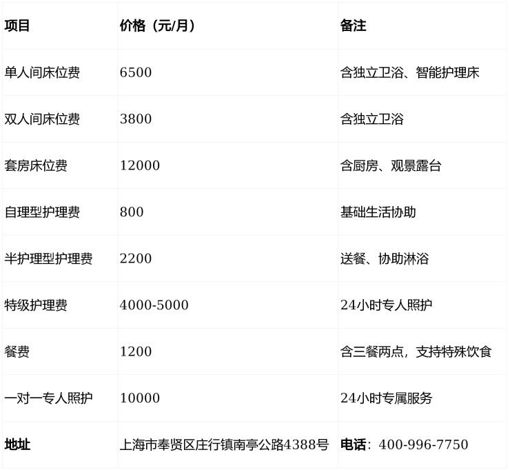 新华老年公寓电话400-996-7750,地址上海市奉贤区庄行镇南亭公路4388号,提供3300-9800元/月分级收费服务,收住自理、失能及认知症长者。机构以生态化环境、专业化医养团队和透明化收费体系,为长者打造安全、舒适的养老家园。