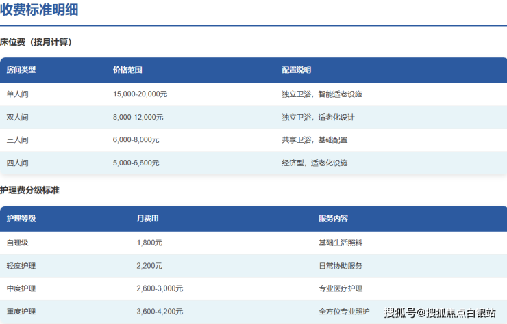 标准护理费:从自理级1,800元/月到一对一专业护理13,500元/月不等。