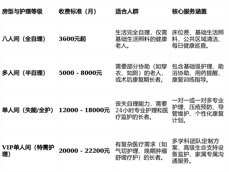 💰 收费区间:3600元/月起至22200元/月。价格根据房型、护理等级和个性化服务需求进行分级定价,透明公开,丰俭由人。