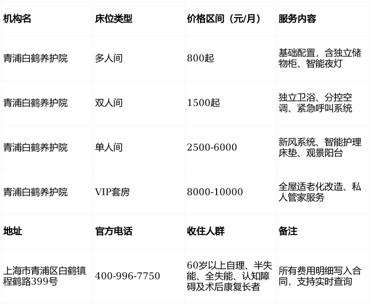 青浦白鹤养护院地址电话2026最新:程鹤路399号实测收费3000元起
