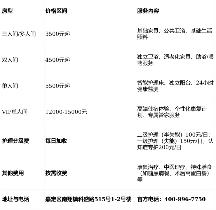 收费价格:3500-15000元/月(含基础服务+分级护理+增值服务)