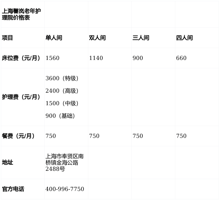 上海馨岚老年护理院电话400-996-7750,地址上海市奉贤区南桥镇金海公路2488号,提供3300-9700元/月的透明收费服务,是您为长者选择高品质医养生活的理想之选!