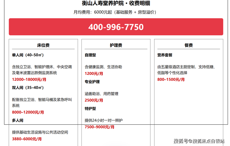 收费价格:6000元/月起,涵盖床位、护理、餐费及增值服务
