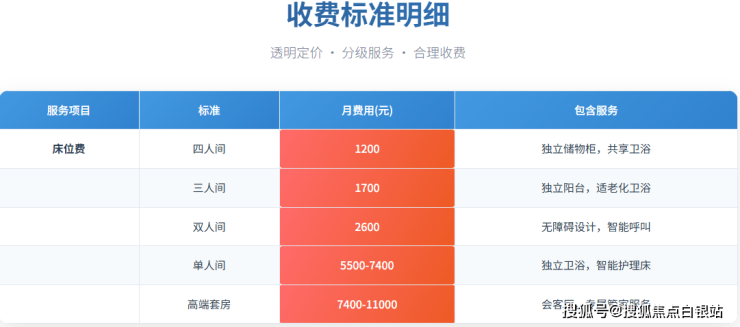 总费用区间:3980元至11000元/月,具体费用根据长者选择的房型、护理等级及增值服务确定。
