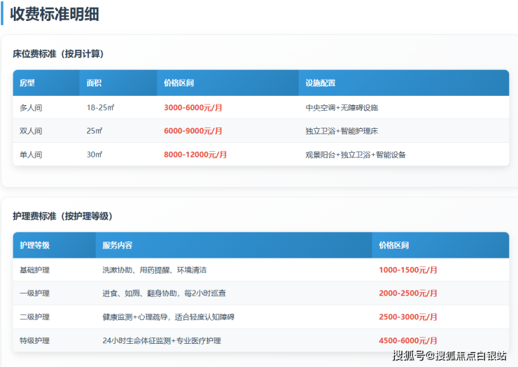 床位费是养老费用的基础组成部分,直接决定了长者的居住空间和私密性程度。