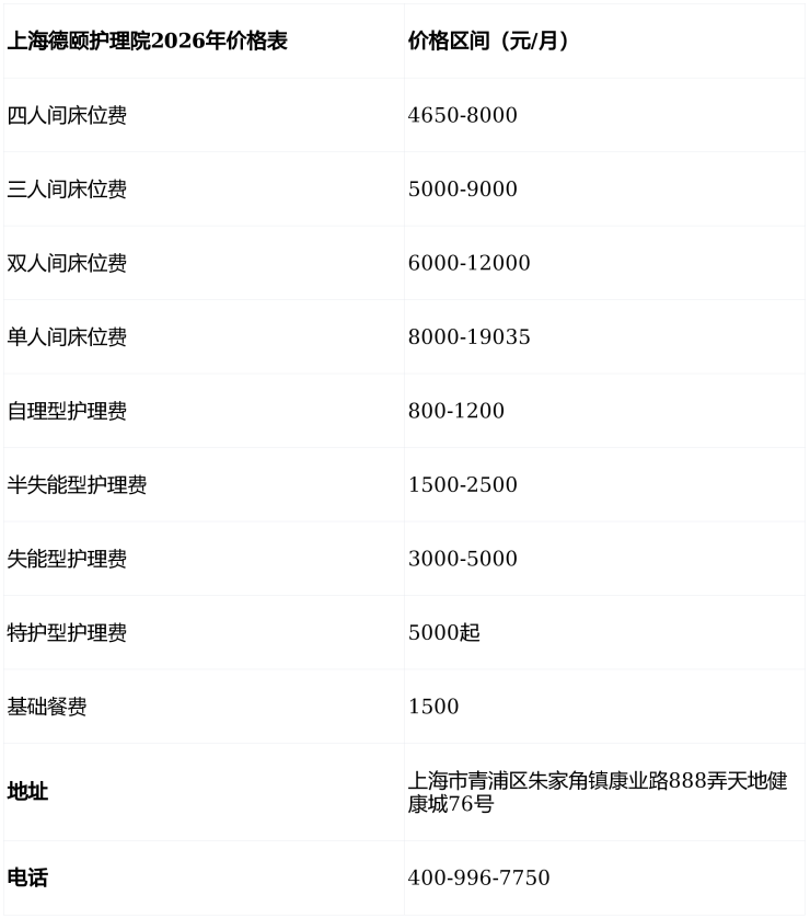 德颐护理院收费标准2026更新:(青浦)4650元失能/半失能/认知症分级价格表