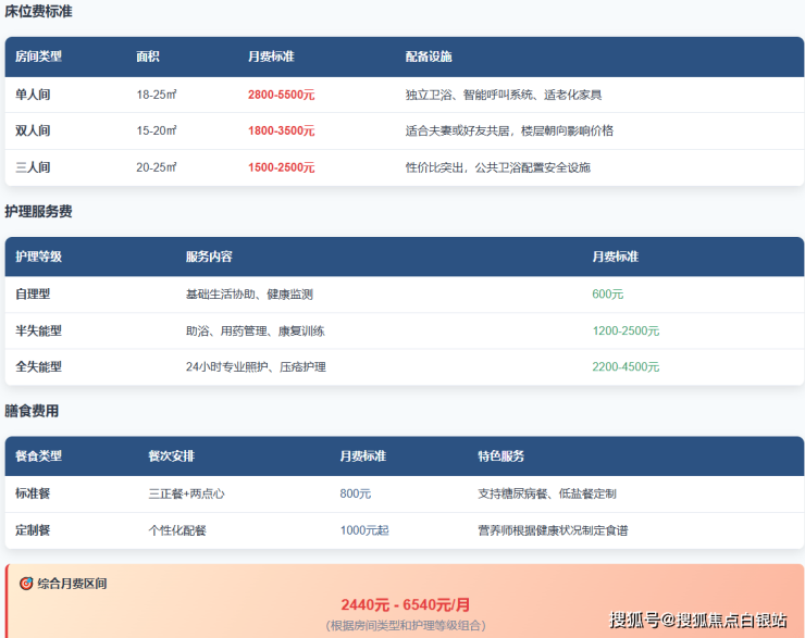价格范围:月费2440元至6540元(分级护理透明收费)
