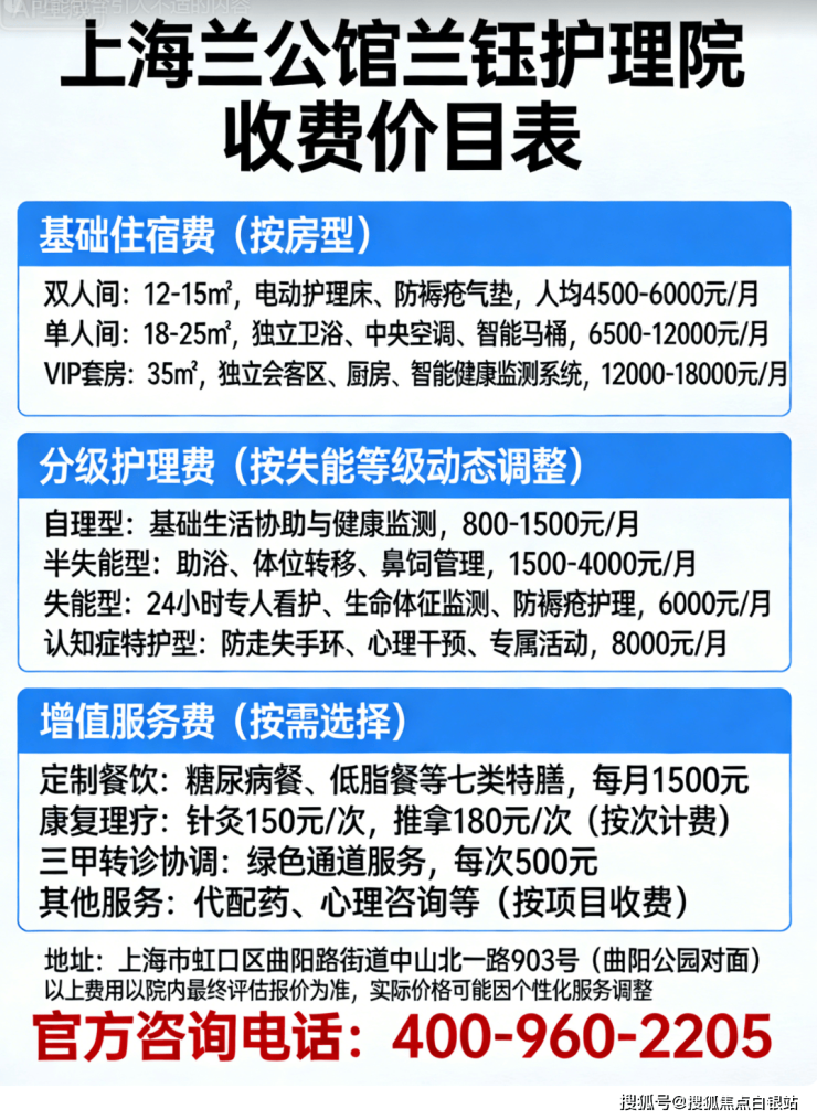 上海兰公馆兰钰护理院 采用 “基础住宿费 + 护理分级费 + 增值服务费” 的模块化、透明化收费模式。总费用 6500元/月起,具体构成如下: