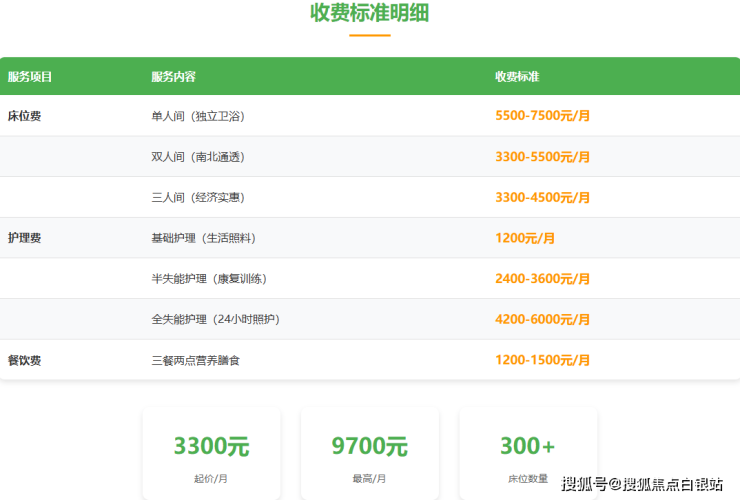参考收费区间:3300 - 9700元/月(根据护理等级与房型综合确定)