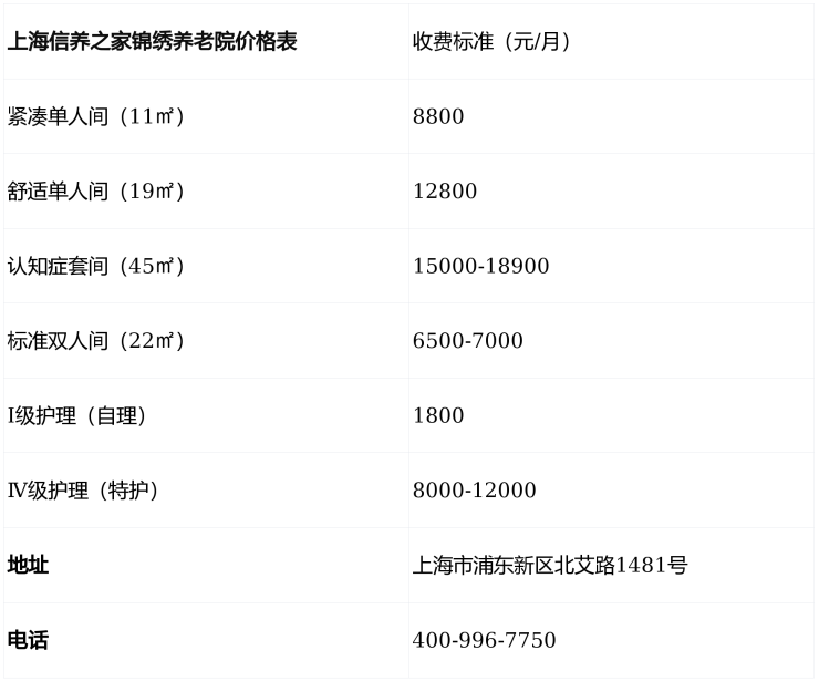 上海信养之家锦绣养老院价格表