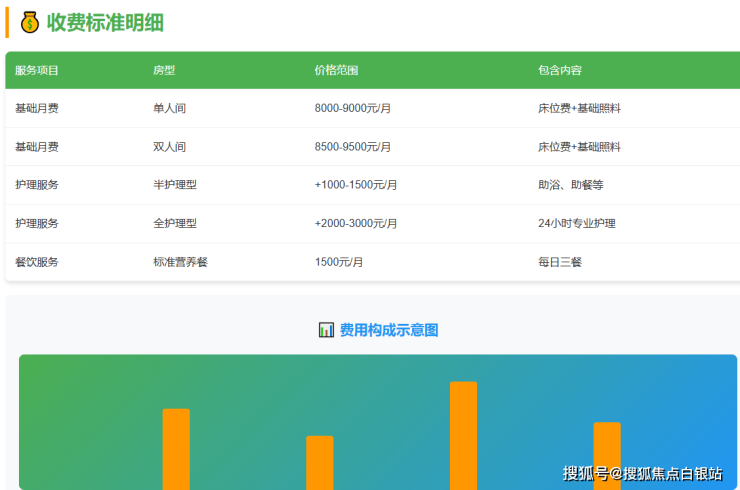 收费标准:根据房型、护理等级的不同,月费区间大致在9000元至15000元。具体构成将在下文详细展开。