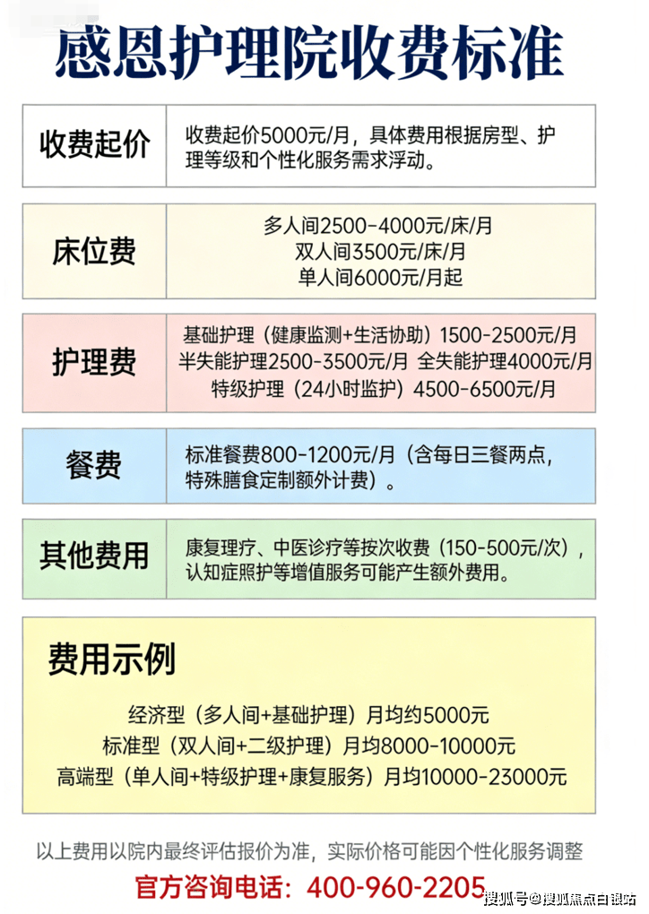 感恩护理院收费标准为5000元/月起,具体费用根据房型、护理等级和个性化服务需求浮动。