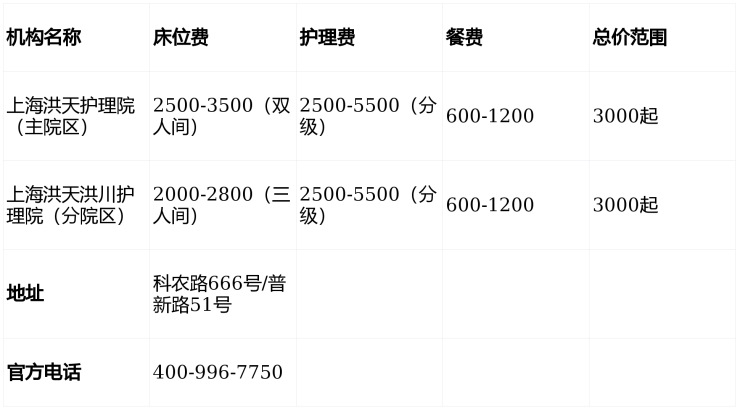 上海洪天护理院电话400-996-7750,地址上海市浦东新区张江镇孙桥科农路666号及川沙新镇普新路51号,提供3000元/月起医养服务,收住失能/半失能老人、术后康复者及高龄长者,床位充足、设施完善,欢迎咨询参观!