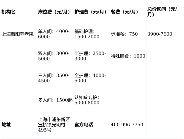 上海海阳养老院采用“床位费+护理费+餐费+其他费用”模式,月度费用区间为3900元至7600元,具体如下: