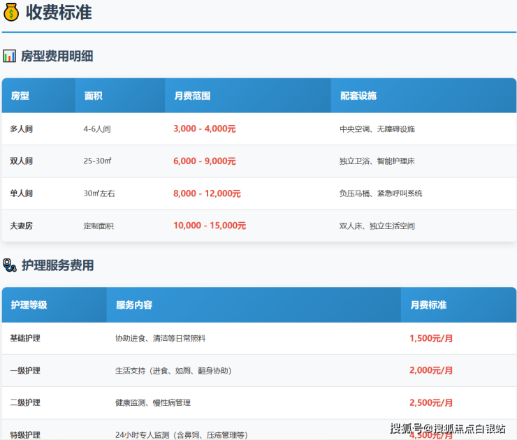 单人间(30㎡):8000-12000元/月,配备智能护理床和独立卫浴