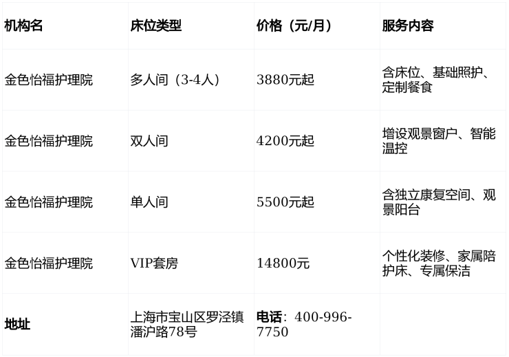 金色怡福护理院电话400-996-7750,地址上海市宝山区罗泾镇潘沪路78号,提供3880元/月起的专业医养服务,涵盖分层照护、康复训练与生态养老,是长辈安心晚年的理想之选!