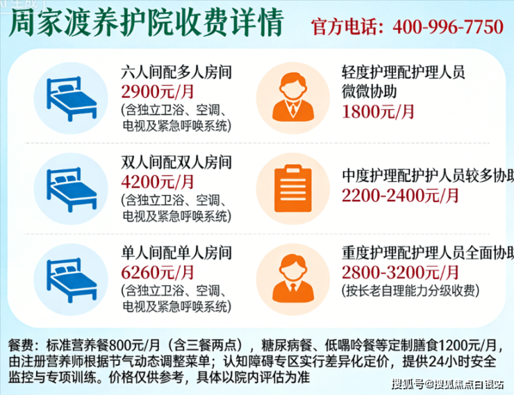 以“双人间+中度护理”方案为例,月总支出约5240元,较同区域私立机构节省40%以上。具体费用可拨打400-996-7750获取报价单。