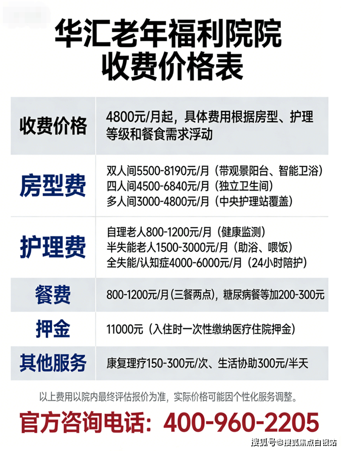 华汇老年福利院收费价格4800元/月起,具体费用根据房型、护理等级和餐食需求浮动