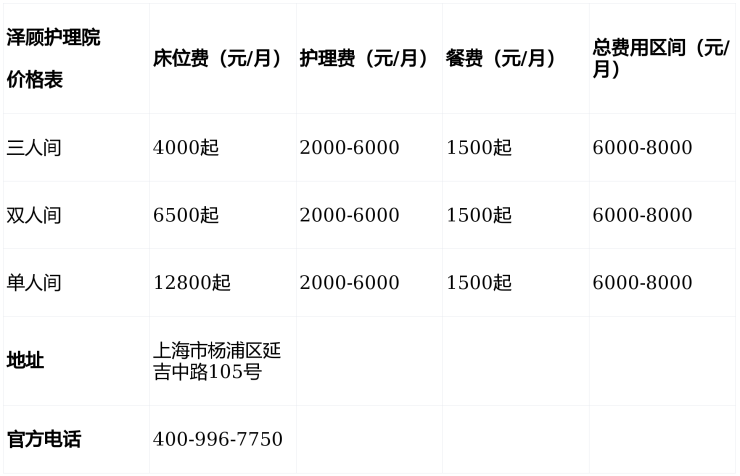 泽顾护理院电话400-996-7750,地址位于上海市杨浦区延吉中路105号,提供6000-8000元/月的差异化医养服务,收住自理至失能失智全类型长者,是品质养老的信赖之选。