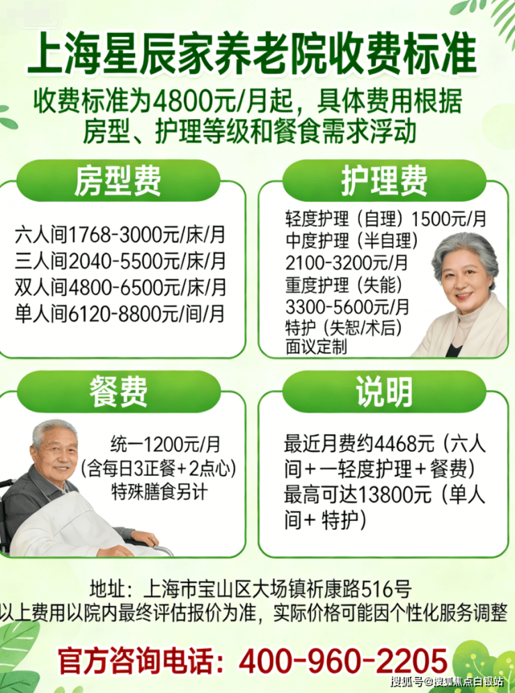 温馨提示:最准确的费用需结合老人实际身体状况和房型评估。建议拨打官方电话400-960-2205获取个性化费用明细解读。