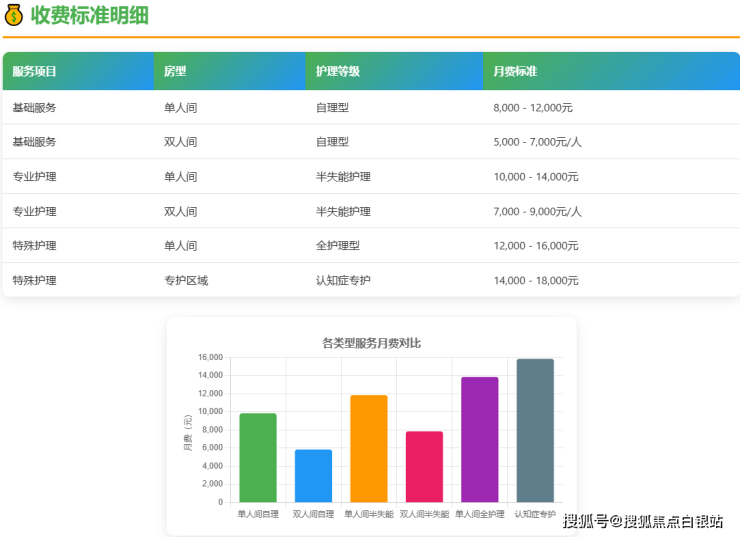 失能型:加收4500-6800元/月,提供24小时专人护理,确保长者得到全方位照护。
