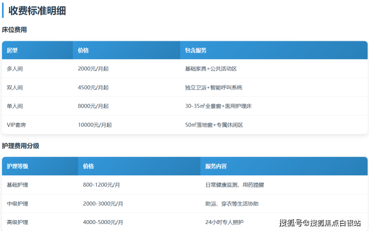 高级护理:4000元/月。为失能长者提供24小时专人照护,包括体位管理、鼻饲/导尿等专业操作。