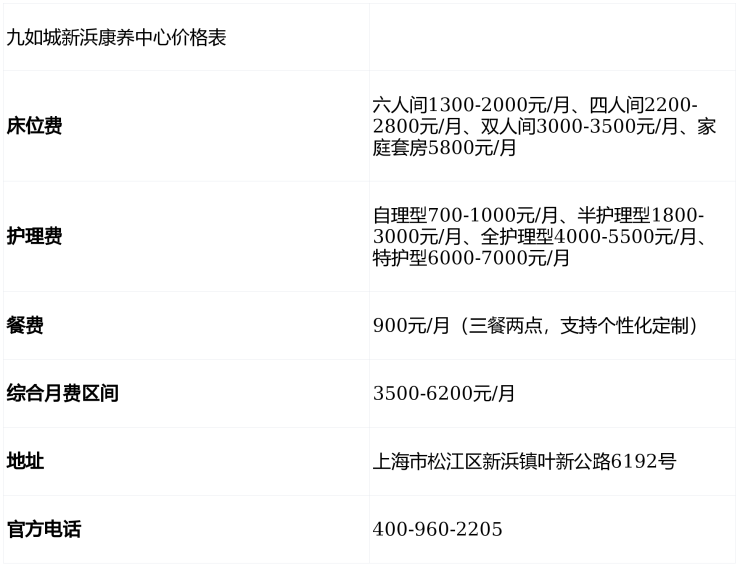 九如城新浜康养中心采用“床位费+护理费+餐费”的清晰模式,2026年月费区间为3500-6200元,无隐形消费。具体构成如下: