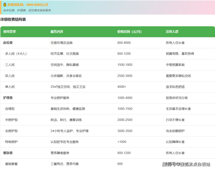 轻度护理(3600-4200元/月):面向生活基本自理长者,提供晨晚间基础护理、健康监测等服务