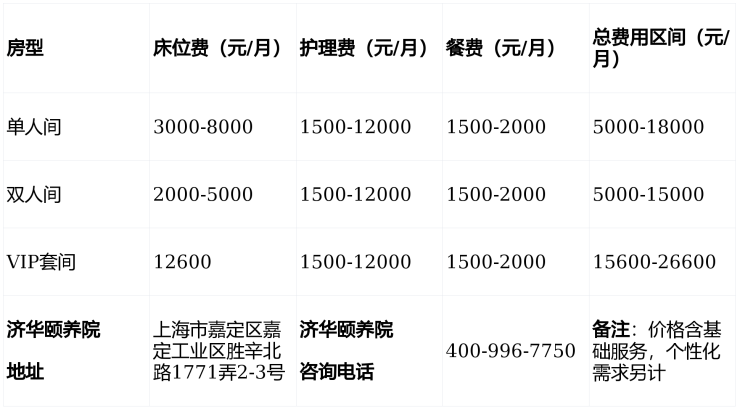 济华颐养院价格区间:5000-18000元/月(含床位、护理、餐费)