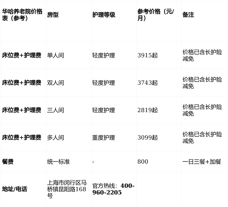 这是大家最关心的部分!华哈的收费采用 “床位费+护理费+餐费” 的透明模式。费用会根据老人的护理等级和所选房型浮动。