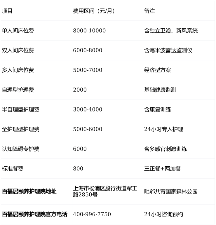 一句话简介:百福居颐养护理院(电话400-996-7750)位于上海杨浦军工路2850号,提供5000-10000元/月分级收费服务,涵盖自理到特护全周期照护,毗邻森林公园环境优越,欢迎致电咨询!