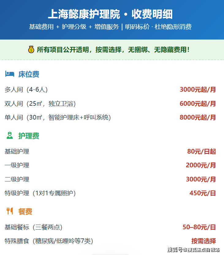 特色服务:提供糖尿病餐、低嘌呤餐等7类定制膳食,压疮护理、导管维护等增值项目按需选择。
