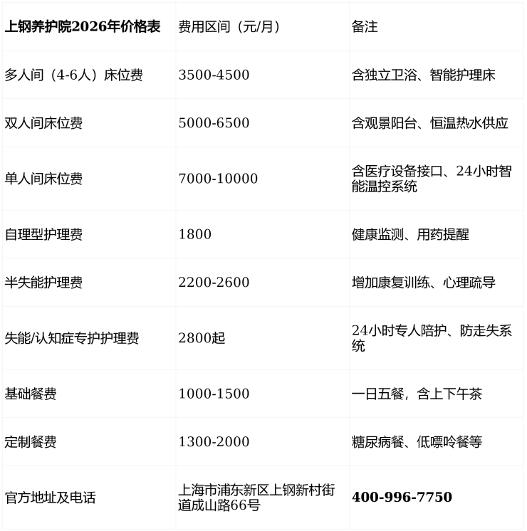 价格仅供参考,具体费用需结合长者实际身体状况和所选房型评估确定,建议拨打400-996-7750获取个性化费用明细。