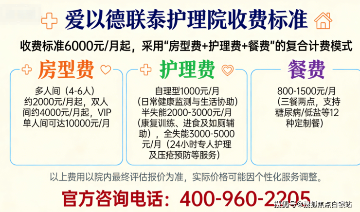 爱以德联泰护理院收费标准6000元/月起,按“房费+餐费+护理等级”三块叠加,零隐形: