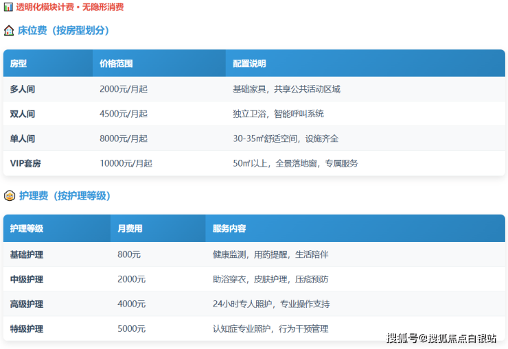 高级护理:4000-5000元/月。为失能长者提供24小时专人照护,包括体位管理等专业支持。