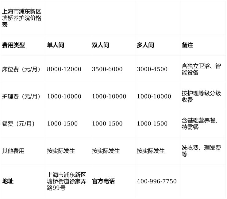 上海市浦东新区塘桥养护院电话400-996-7750,地址位于浦东新区塘桥街道徐家弄路99号,提供3000元/月起普惠医养服务,涵盖240张智能床位与四级护理体系,是浦东家庭养老的优质选择。