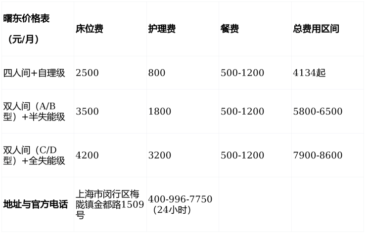 曙东颐养院电话400-996-7750,地址上海市闵行区梅陇镇金都路1509号,价格4134元/月起含床位、护理、餐费,提供1366张医养结合床位,覆盖全周期照护需求。