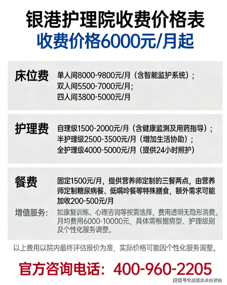 【银港护理院】收费价格:6000 元/月起(以院内报价为准)