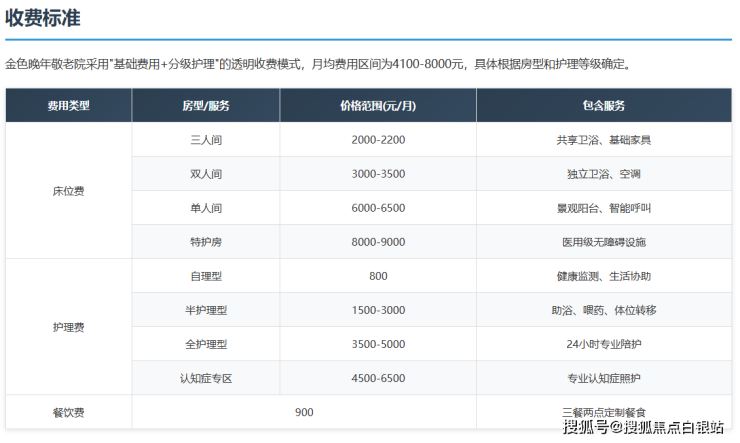 金色晚年敬老院采用分级收费模式,费用构成清晰透明: